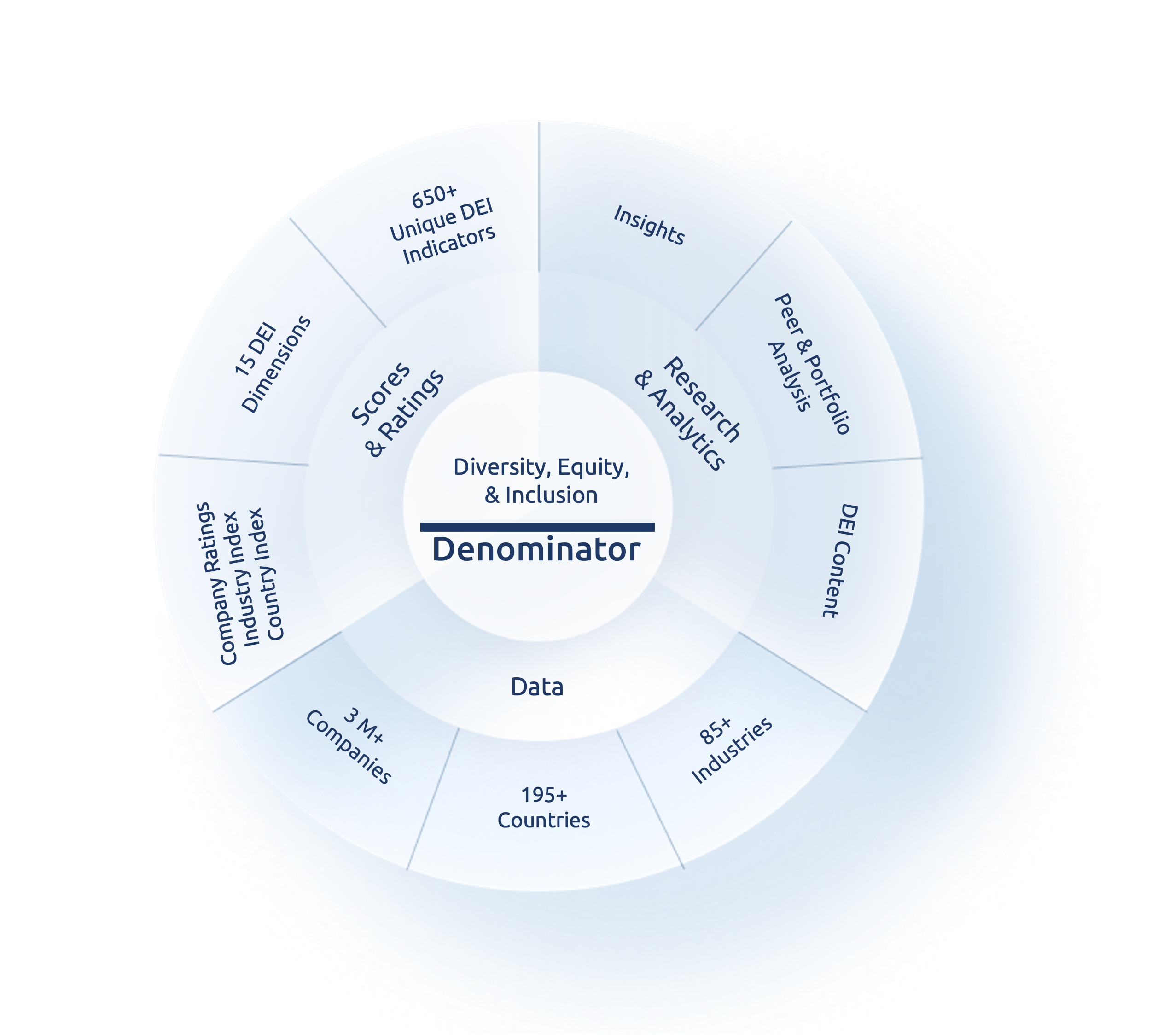Denominator adheres to a holistic approach to DEI by gathering data on more than 650+ unique DEI data indicators across 15 dimensions that are all rooted in our 3 main pillars, Diversity, Equity, & Inclusion. Denominator’s dataset is global in nature and covers more than 3 million companies, 195+ countries, and 85+ industries and sectors.